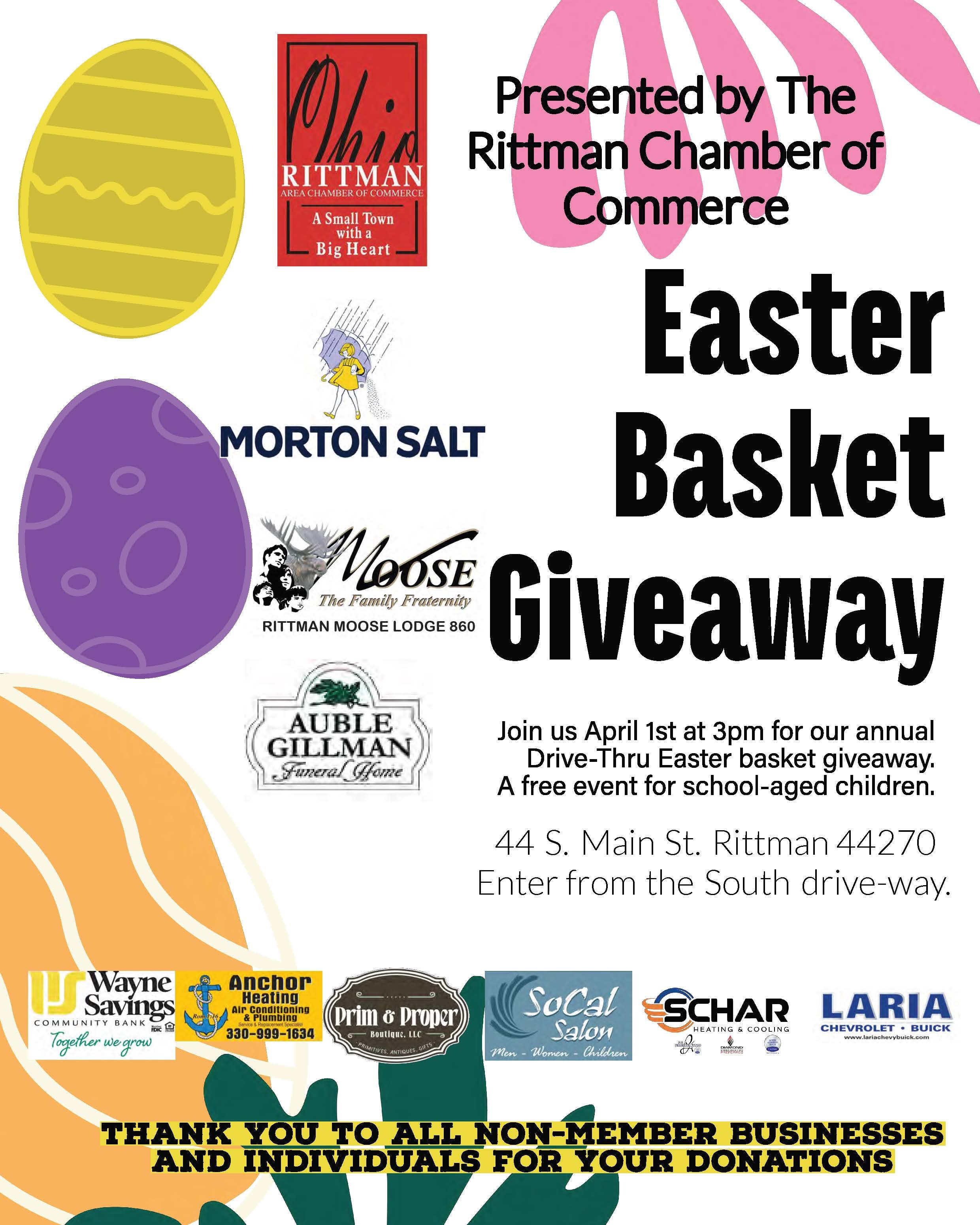 Join us for our 4th Annual Rittman Chamber of Commerce Drive-Thru Easter Basket Giveaway! Giving out upwards of 500 Easter Baskets to area children again this year! Swing through to pick up a fantastic Easter Basket! Baskets presented on a first come first serve basis to school-aged children. Children must be present to receive a basket.